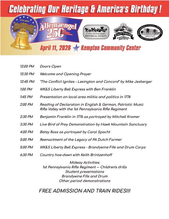 Lehigh County's commemoration of the 250th anniversary of the birth of our country invites the people and neighborhoods through civic engagement, local celebrations, and legacy projects to create a cultural and economic impact remembered for years to come.